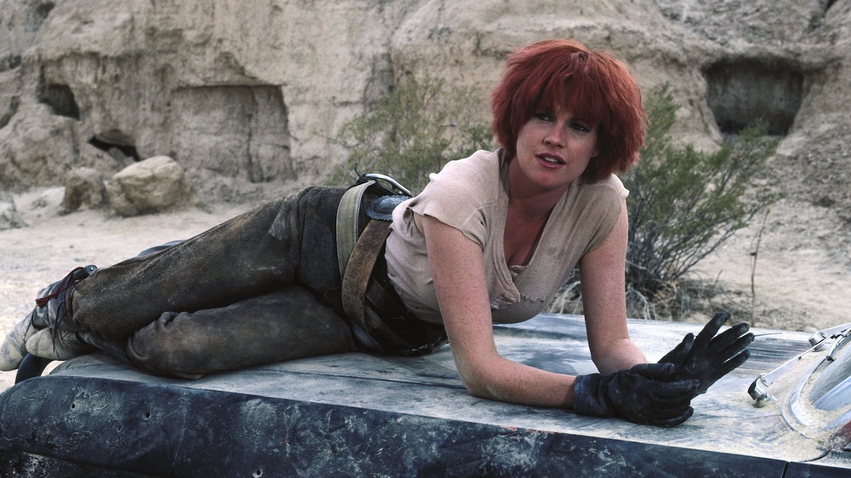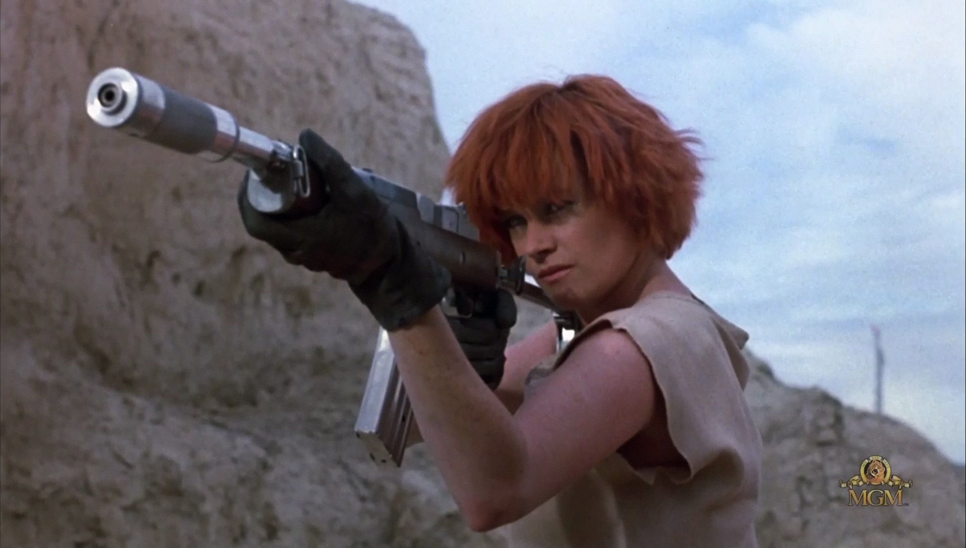 Nous voici donc basculés dans le film d’aventures lorgnant vers le western avec, qui plus est, une héroïne démerdarde et prête à tout, jolie de surcroît, puisqu’il s’agit de Melanie Griffith. À ses côtés, notre naïf héros va bien sûr vivre plein d’aventures. Une Melanie bodybuildée sur l’affiche, clin d’œil à tous les films d’heroic fantasy de l’époque dont le matériel commercial attiraient le chaland avec des filles très sexy charpentées comme des bucherons — voir la représentation de Sandahl Bergman sur l’affiche de Conan le Barbare.