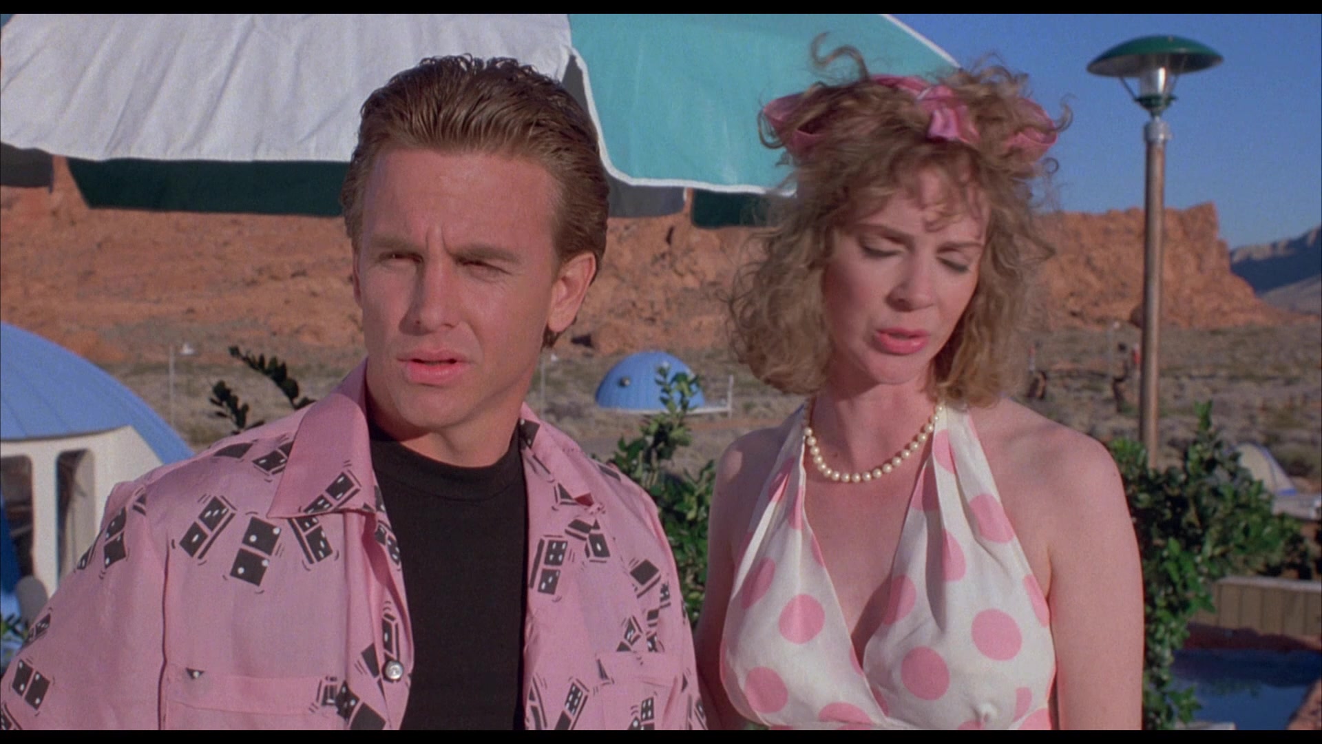 Dans cette Amérique détraquée, il suffit que le héros décline son identité et annonce sa ville d’origine (Anaheim), pour que son interlocuteur éclate de rire et toute l’assemblée avec lui. De Jarnatt multiplie ainsi les détails insolites. Dans un bar louche, David Andrews commande un rhum et un biscuit avant d’être interpellé par un individu suspect (Brion James) qui lui demande ce qu’il veut boire… et s’il prend un biscuit. Et bien sûr, on se demande : mais pourquoi un biscuit ? Quant au Sky Ranch perdu au milieu du désert, il est le symbole de l’Amérique triomphaliste des piscines et des jeunes gens lookés comme James Dean. De Jarnatt partage ce genre d’humour loufoque avec Matt Groening, l’auteur de Futurama et des Simpsons, son copain de chambrée à la fac (selon l’historien du cinéma et scénariste Fathi Beddiar, interrogé dans le bonus sur son amitié avec De Jarnatt).