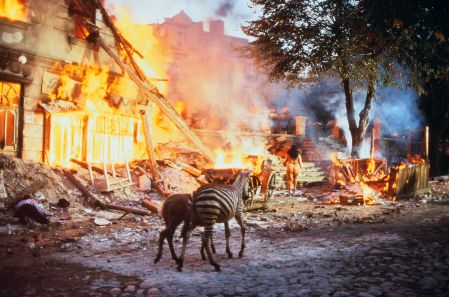 Underground démarre et s’achève en fanfare et, entre temps, la musique aura bercé la quasi totalité du film tandis que s’engloutissent des hectolitres d’alcool. Le burlesque est souvent au rendez-vous qui, soudain, se mue en poésie. On s’en rend compte dès les premières séquences et le bombardement du zoo où travaille Ivan (Slavko Stimac), le frère de Markos, avec les animaux qui errent dans les ruines.