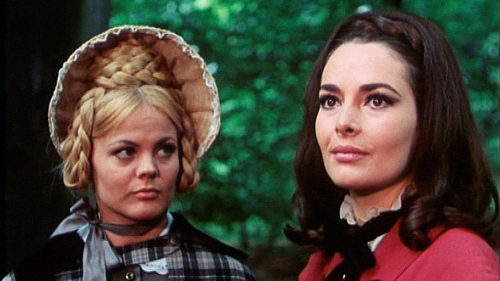 Puis commence le voyage en diligence pour se rendre dans le château du comte Regula (Christopher Lee), occasion pour Reinl d’offrir plusieurs séquences étranges, poétiques et parfaitement maîtrisées. Pensons à ces chevaux noirs emballés qui croisent le chemin des voyageurs et à cette forêt magique dont des mains sortent des troncs, à la manière des fantasmagories de Jean Cocteau, et dont les arbres portent des pendus.