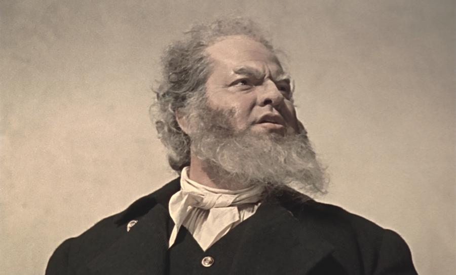 Le premier morceau de bravoure, pour John Huston, est le prêche d’un pasteur du haut d’une chaire en forme de proue. Joué par un Orson Welles tonitruant et cabotin, la scène est grandiose d’autant que la caméra filme aussi, le long des murs de l’église, des ex-voto mentionnant divers naufrages. La religion est beaucoup présente et c’est normal, dès que l’on comprend qu’Achab ne cherche pas à tuer une simple baleine. Du capitaine, on dit immédiatement qu’il porte un nom de damné. Dans la Bible, Achab est en effet un roi impie. On raconte qu’après sa mort, les chiens se sont désaltérés de son sang.